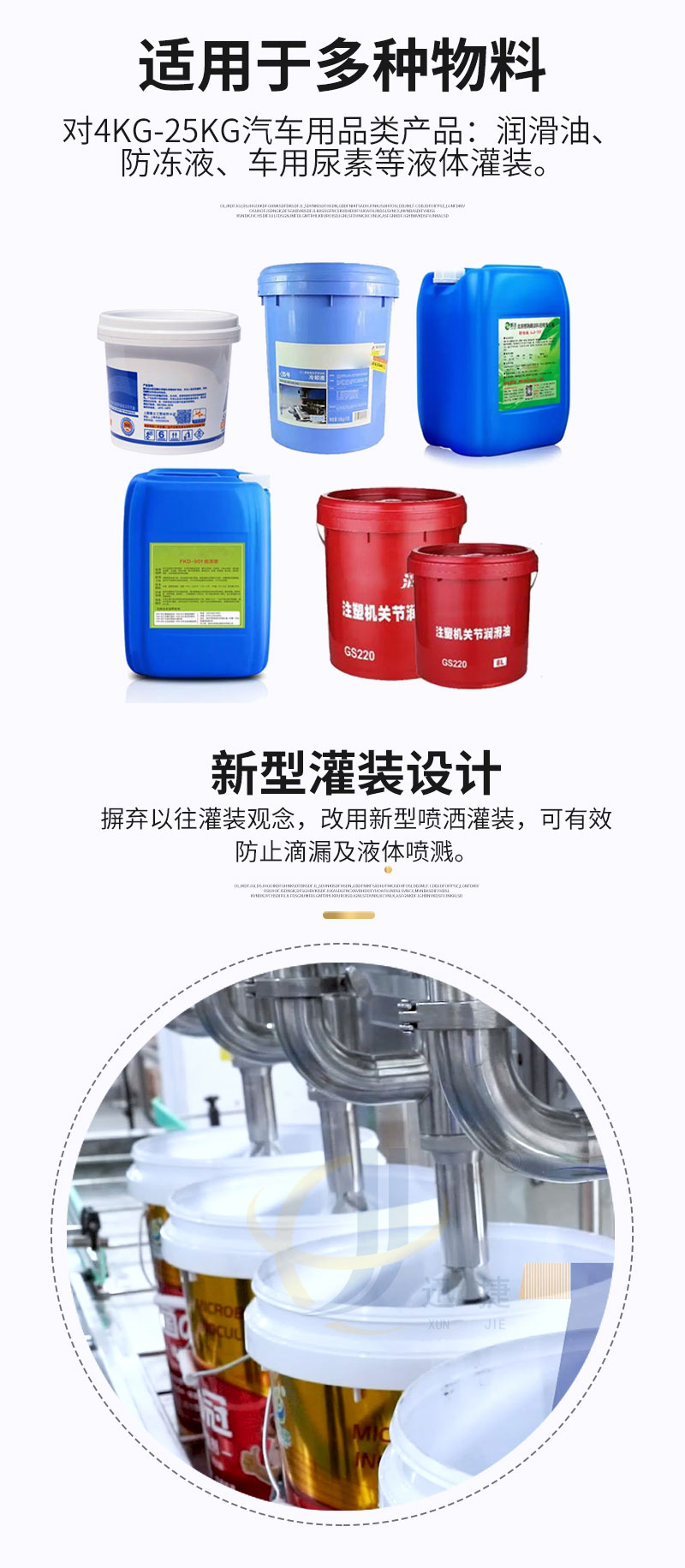 全自動(dòng)稱(chēng)重式灌裝機適用于多種物料,對4kg-25kg汽車(chē)用品類(lèi)產(chǎn)品:潤滑油、防凍液、車(chē)用尿素等液體灌裝。