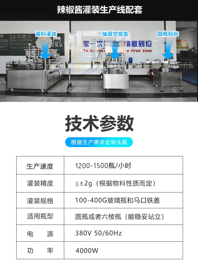 全自動(dòng)雙頭醬料灌裝機兼容6種瓶型,容量范圍內可兼容多種瓶型的灌裝,一鍵式操作,開(kāi)機即能使用。更換瓶型無(wú)需更換配件。