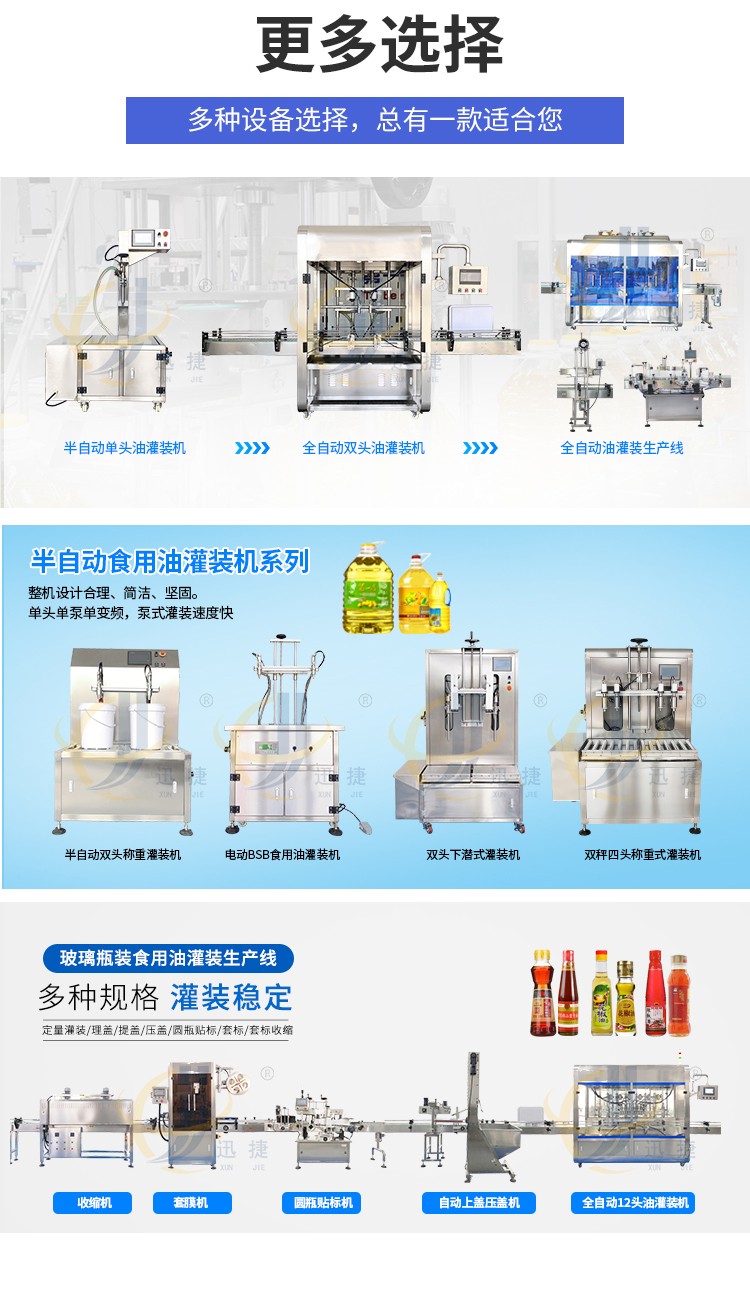 全自動(dòng)油脂灌裝生產(chǎn)線(xiàn)適用于灌裝各種油類(lèi)及粘稠液體,如花生油、調和油、菜籽油等食用油的灌裝??筛鶕嘌b需求定制機型。