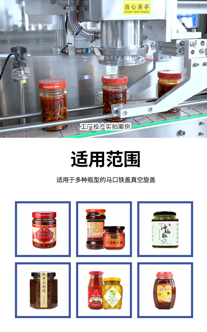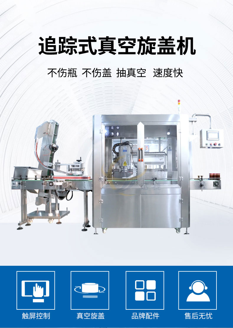 跟蹤式真空旋蓋機適用于多種瓶型的馬口鐵蓋真空旋蓋。設備由PLC結合觸摸屏控制,采用世界知名品牌電器和氣動(dòng)元件,故障率低。