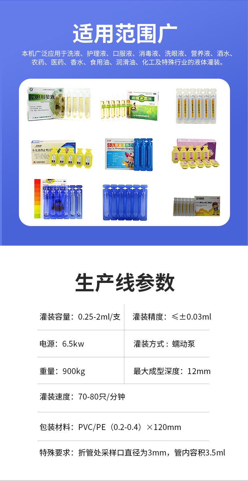 易折試劑管成型灌裝機廣泛使用于護理液、口服液、洗眼液、營(yíng)養液、香水、食用油、潤滑油、化工及特殊行業(yè)的液體灌裝。