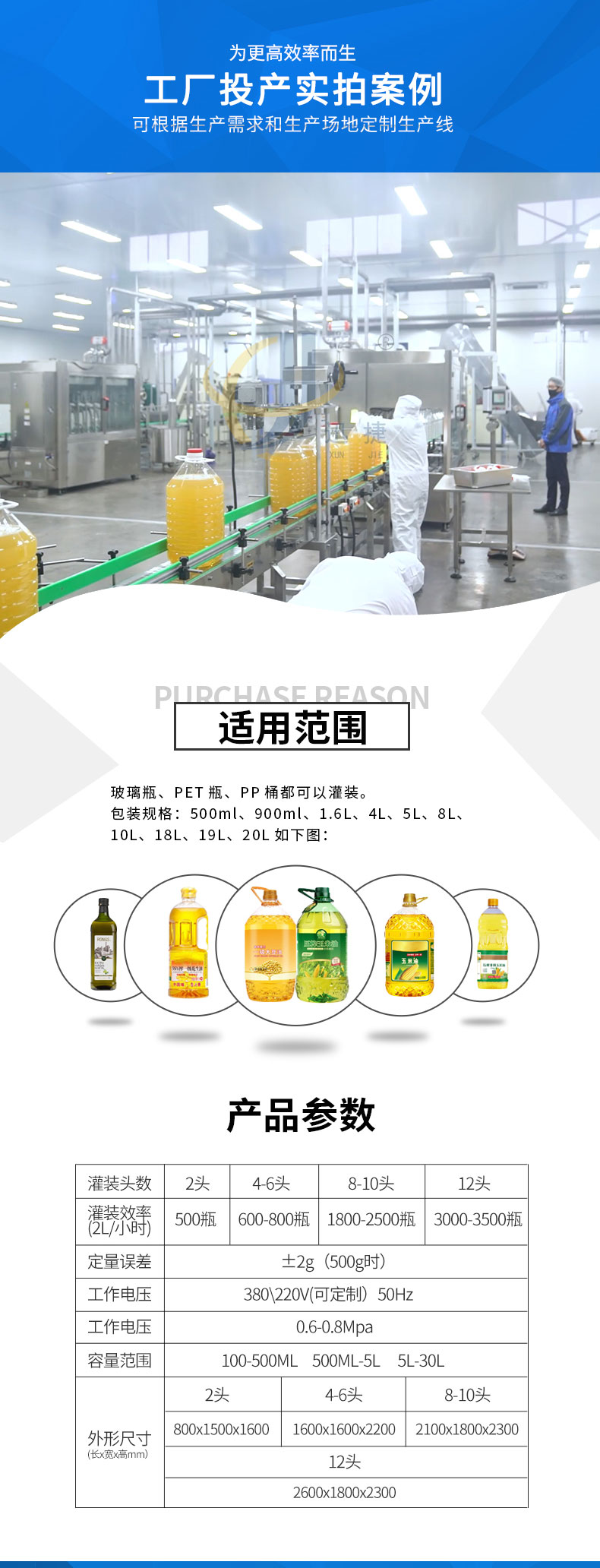 全自動(dòng)食用油灌裝機適用于玻璃瓶、PET瓶、PP桶都可以灌裝。包裝規格:500ml、900ml1.6L、4L、5L、8L、10L、18L。
