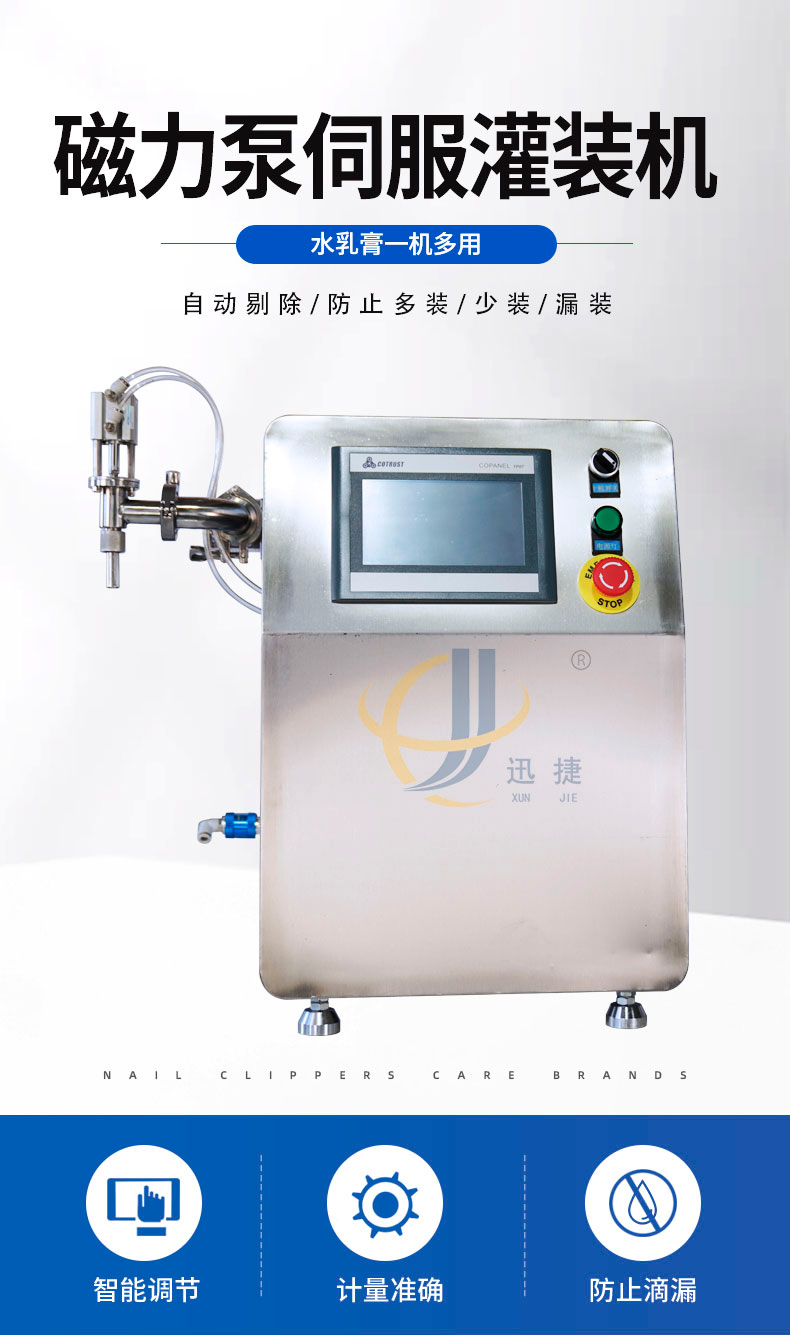 1.本機采用伺服電機驅動(dòng),PLC和觸摸屏控制,316L材質(zhì)齒輪泵灌裝原理,適合日化、醫藥、食品、油脂等各類(lèi)流體和半流體物料定量灌裝。2.灌裝量通過(guò)觸摸屏調節,灌裝量調節無(wú)上限,泵頭易拆裝易清洗,非常適合產(chǎn)品種類(lèi)多,需要經(jīng)常調節范圍的用戶(hù)。3.計量準確,灌裝100ML,可以實(shí)現不大于0.5ML的誤差。